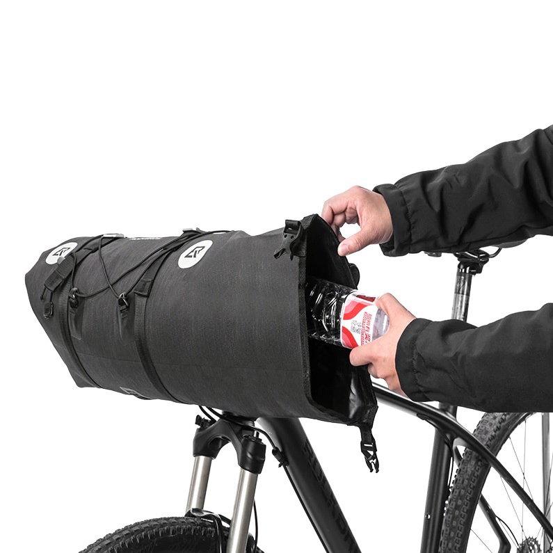 Mocowane na rzepy za kierownicą. Zalety takich toreb - nie wymagają dodatkowych mocowań, pasują do prawie wszystkich rowerów z różnymi rodzajami kierownic, mają paski kompresyjne i kształt, który pozwala zmienić rozmiar torby w zależności od liczby rzeczy.